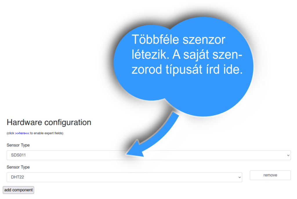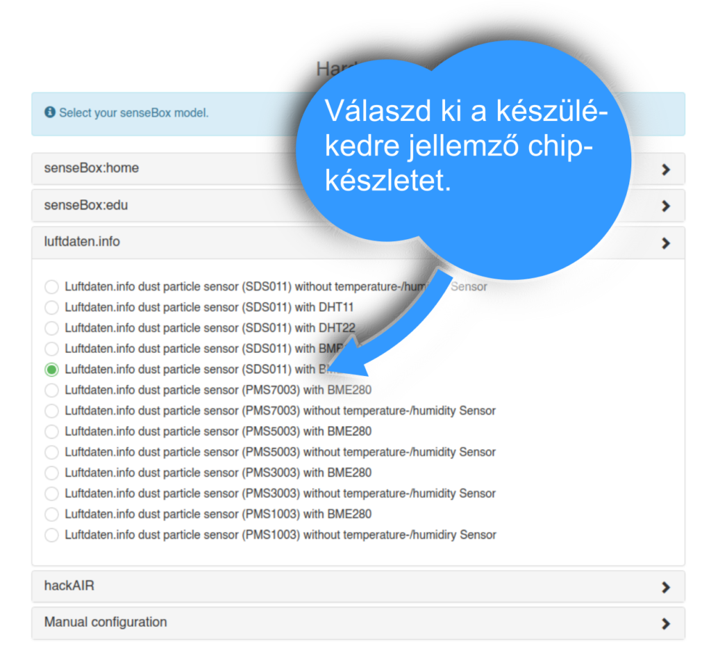 A legtöbb forgalomban lévő szenzor az SDS011-es. Alatta a hőmérséklet és páratartalom mérő típusát kell megadni. Ez legtöbb esetben BME280, de az iskolák egy része SHT3X-et , vagy SHT31-et kapott.