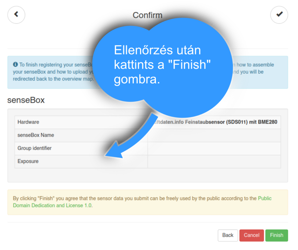 Befejezéskor kapod meg a Sensebox ID-t, amit később a konfigurációs oldalon a megfelelő helyre kell majd beírni.